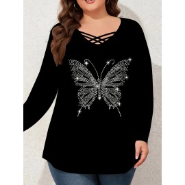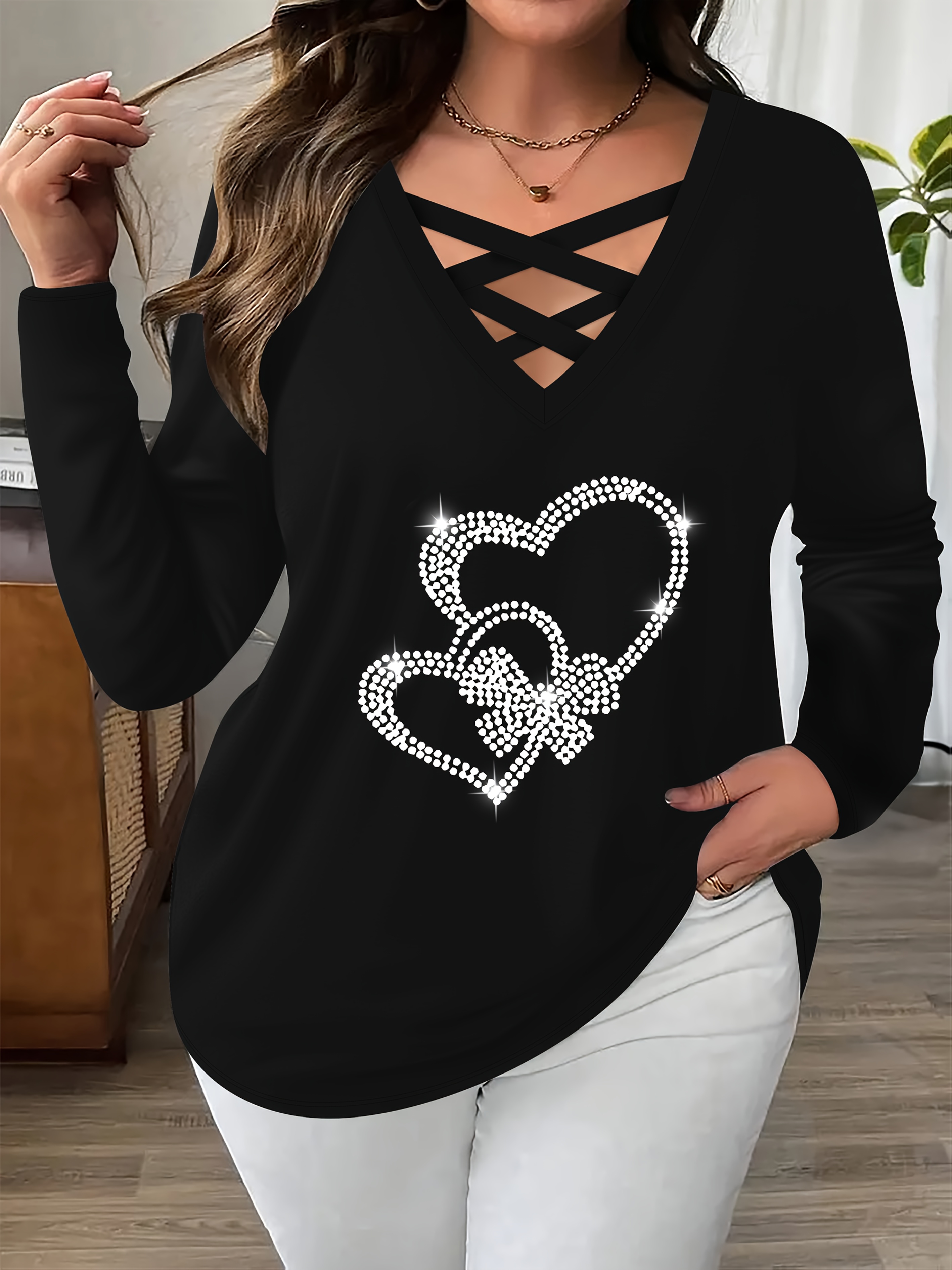 Plus Size - Plus Size Women'S Elegant V-Neck Long Sleeve T-Shirt with Rhinestone Heart & Bow Design - Stretchy Comfort Fit, Black & White Contrast, Cross Strap Detail, Autumn/Winter Fashion Top, Ladies T Shirts, Winter Clothing, Medium Stretch Fabric