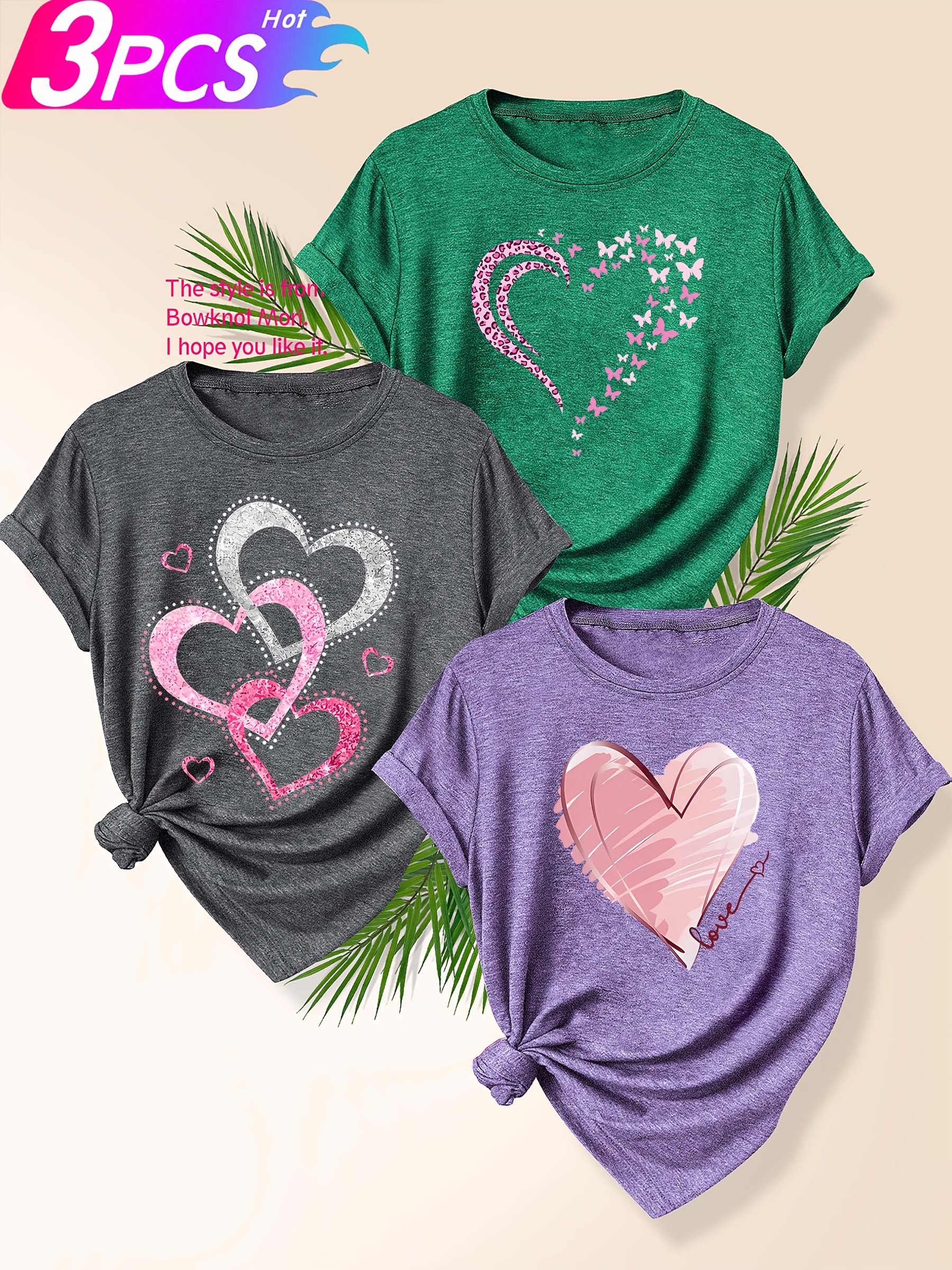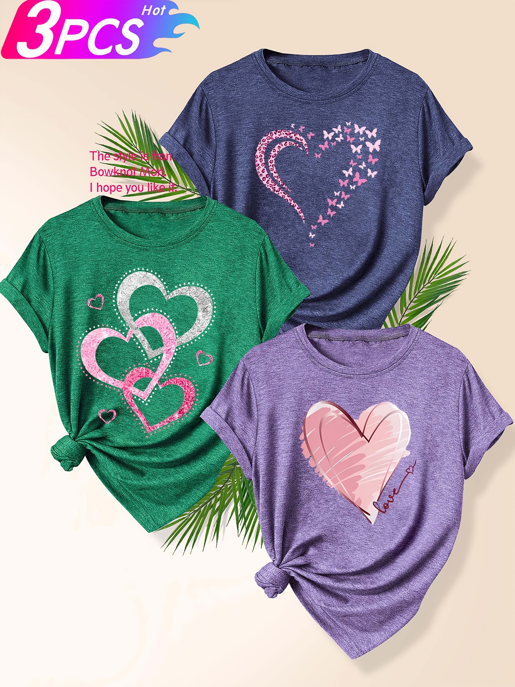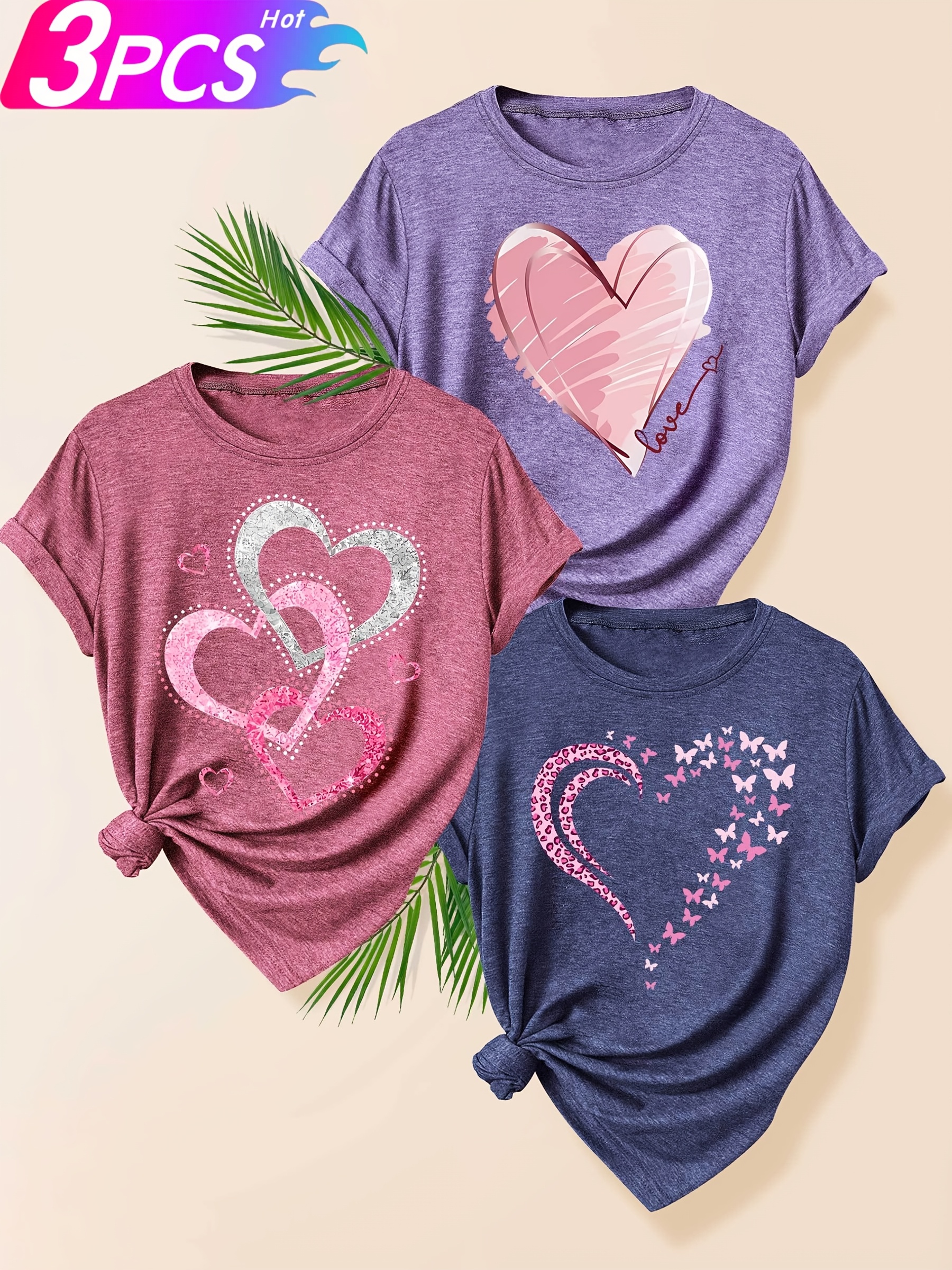 [Cute Heart T-Shirts] 3pcs Women's Heart Graphic T-Shirts | Casual Crew Neck Short Sleeve Tops with