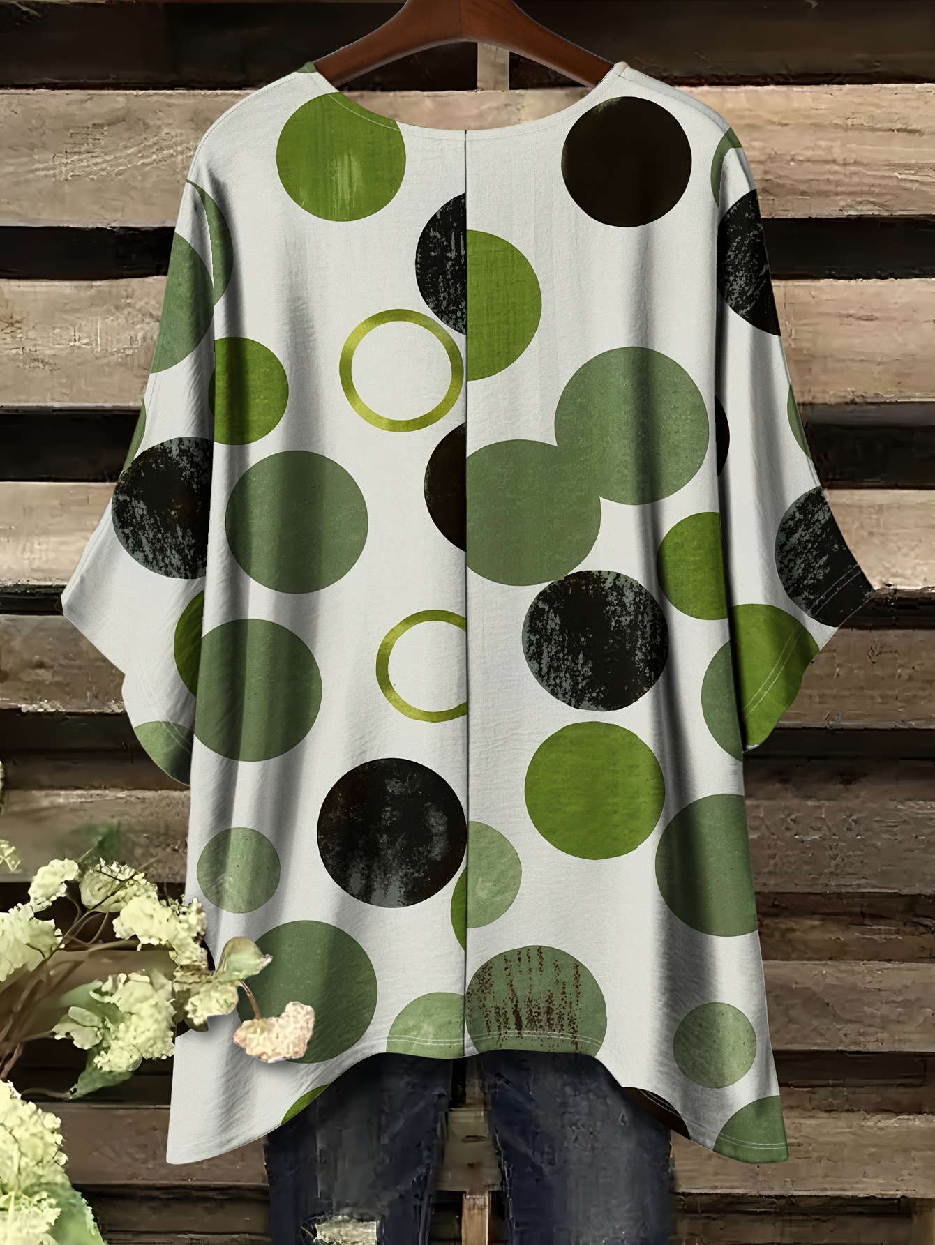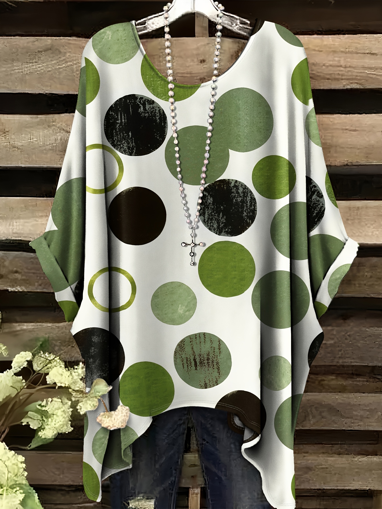 Plus Size, Women's Oversized Green & White Polka Dot T-Shirt - Casual Batwing Short Sleeves, Asymmetrical Hem & Round Neck Summer Top, Breathable All-Season Comfort Fit, Machine Washable Casual Attire (No Jewelry Needed)