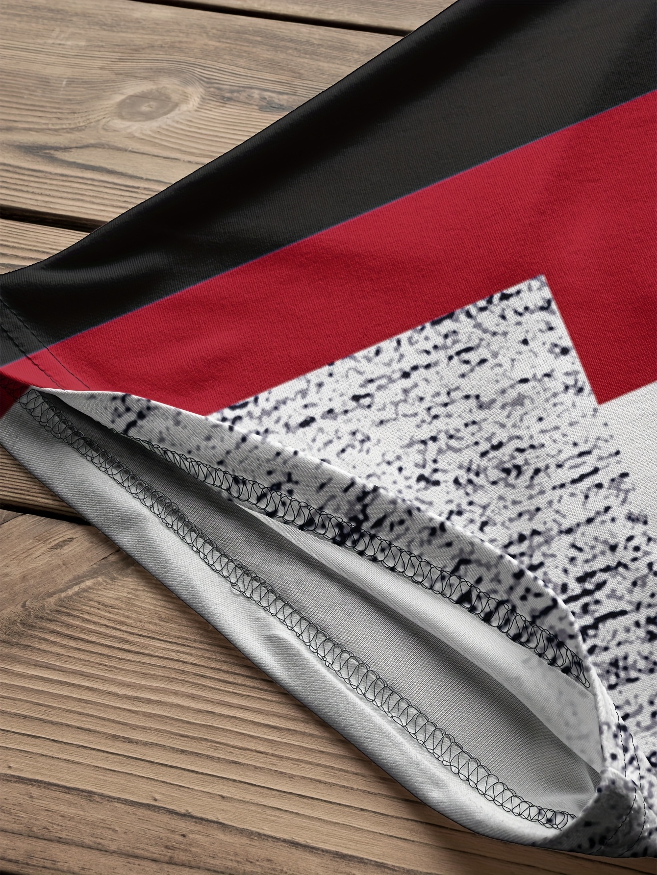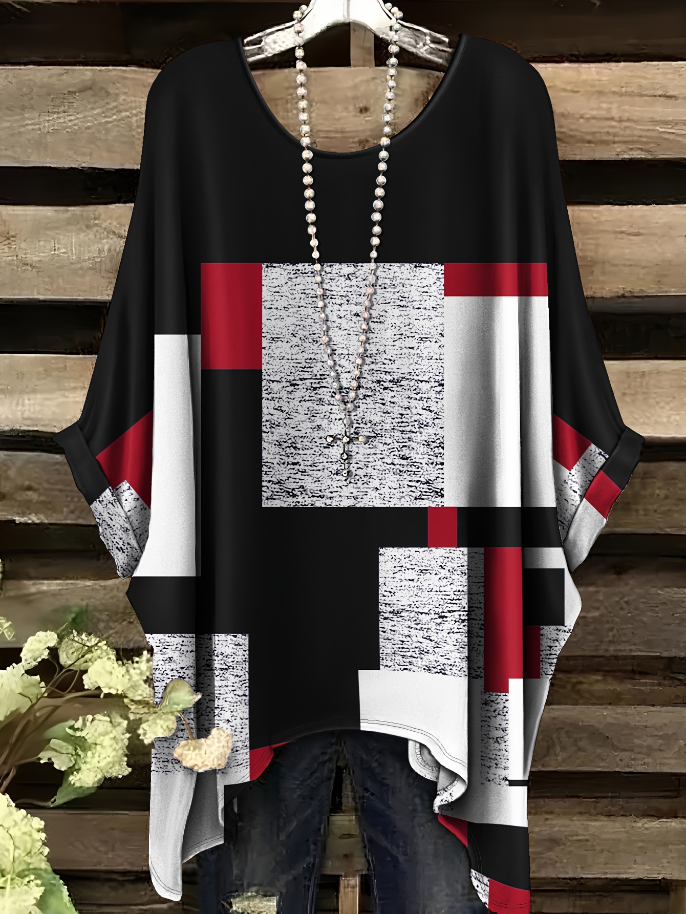 Plus Size - Women'S Plus Size Geometric Print T-Shirt - Casual Crew Neck, Short Sleeve, Asymmetrical Hem, Black & White Design with Red Accents, Comfortable Summer Top, Ladies T Shirts