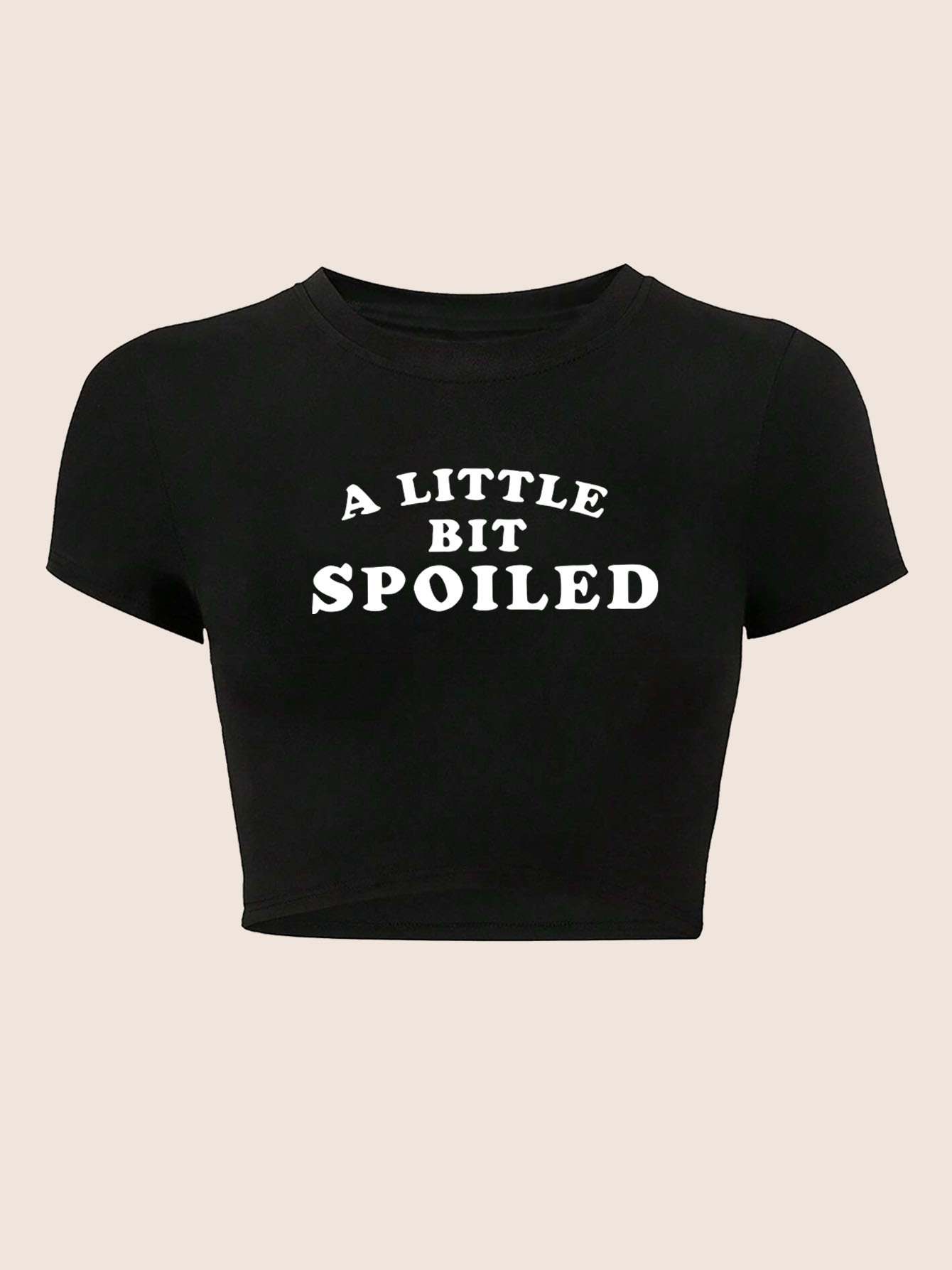 [Graphic Print Crop Top] Women's "A Little Bit Spoiled" Graphic Print Crop Top T-Shirt - Casual & Sporty Short Sleeve, Round Neck, Stretchy Fabric, Black with White Lettering, Summer Essential, Ladies T