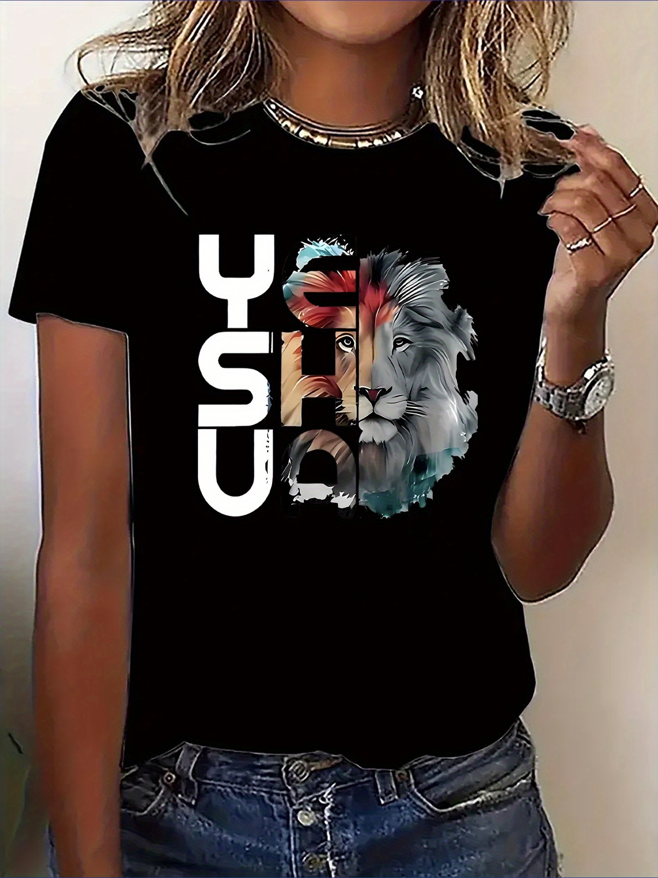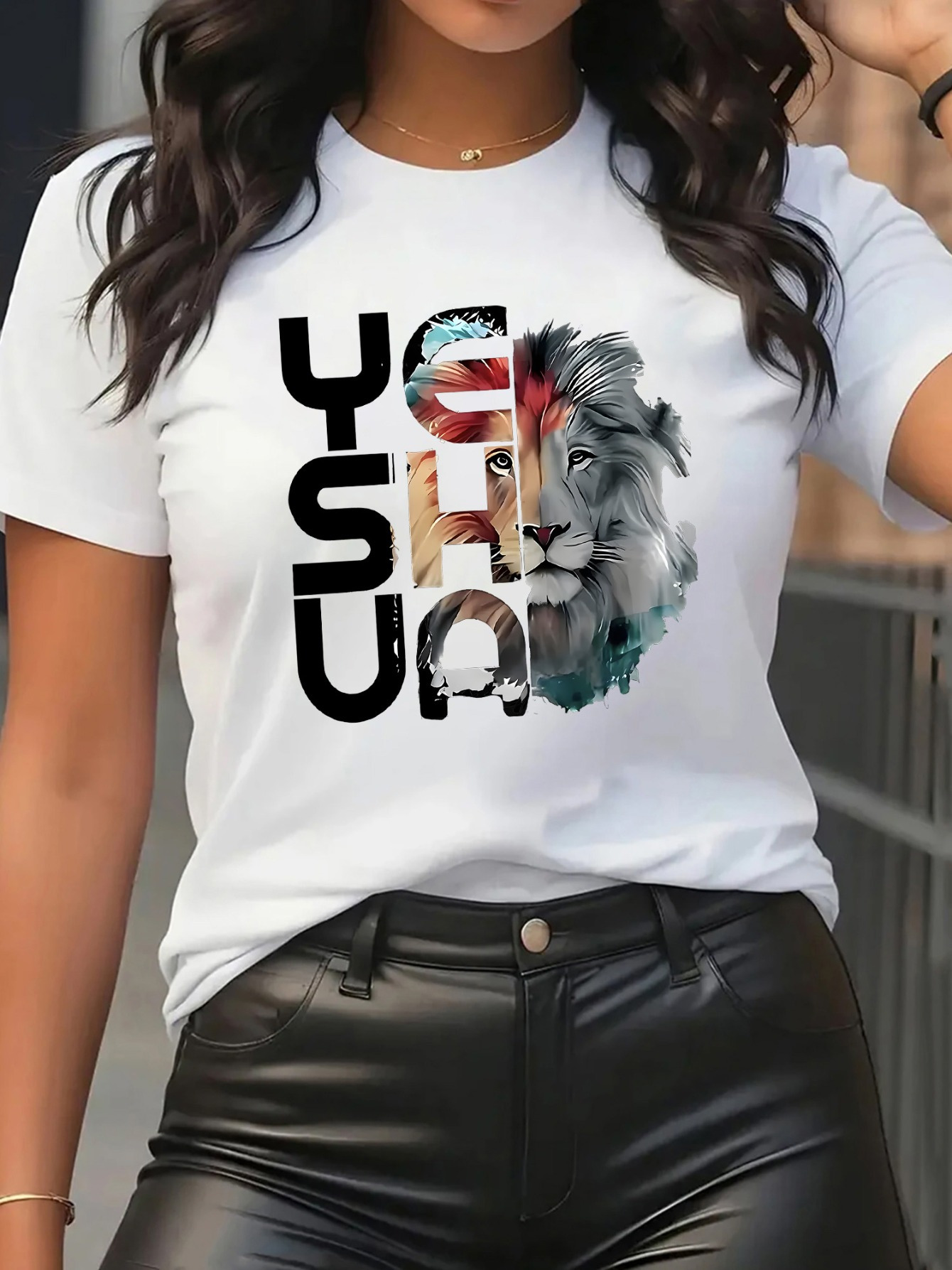 Women'S Casual Short Sleeve T-Shirt with Lion Graphic Design - "YESHUA" Print, White with Colorful Lion Illustration, Comfortable Round Neck Tee for Casual Attire, Ladies T
